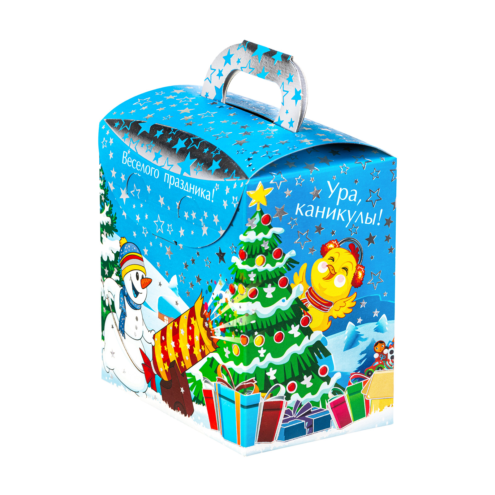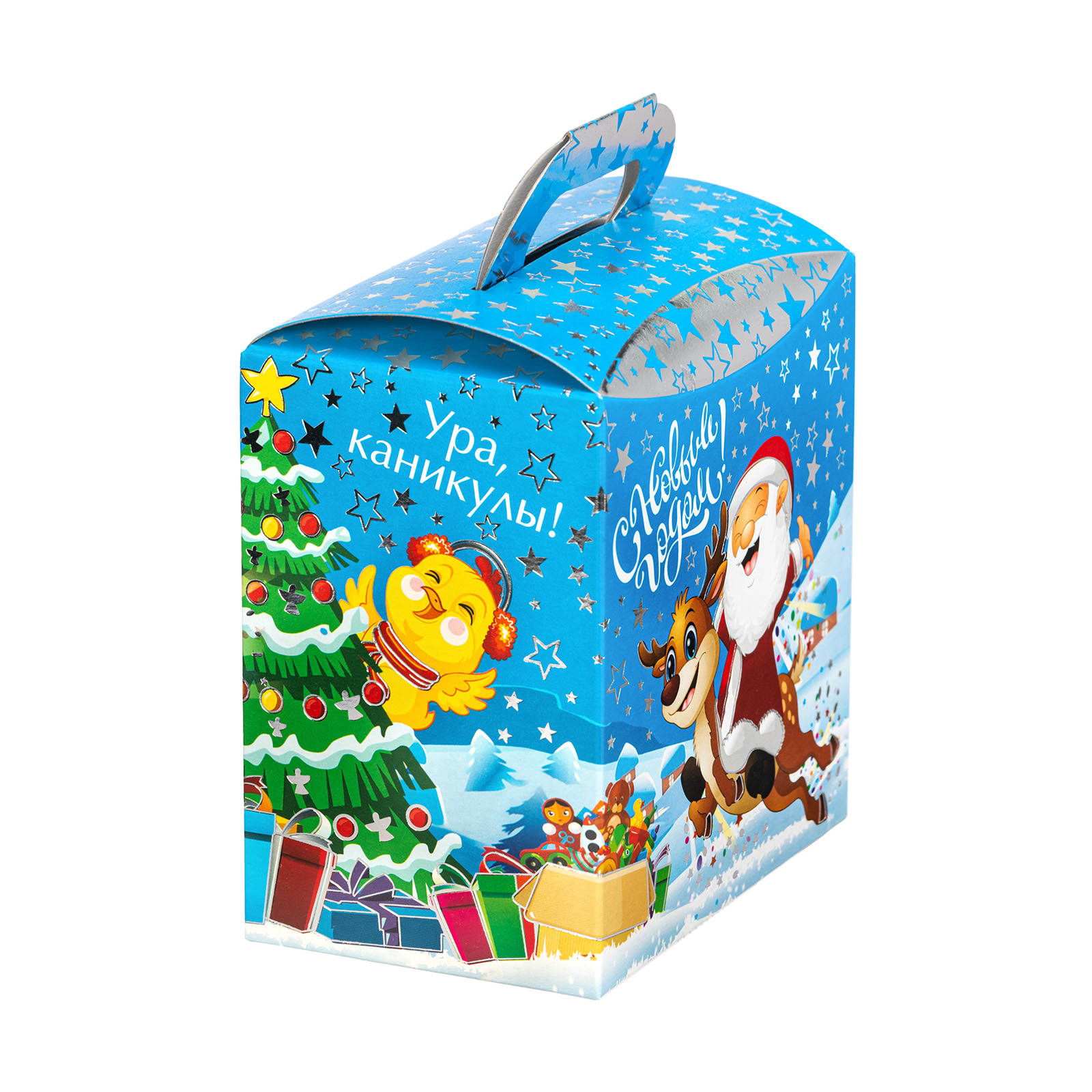 Формула идеального новогоднего сладкого подарка предельно проста: привлекательная яркая упаковка + вкусные сладости внутри. Именно такими характеристиками и обладает данный подарочный набор. Это небольшая картонная коробка с забавной новогодней иллюстрацией, на которой Дедушка Мороз и его верный товарищ олень весело мчатся по заснеженной долине мимо ее обитателей. На упаковке есть поздравительная надпись, сверху находится удобная ручка, но самое главное спрятано внутри этой маленькой коробочки! Там находится 400 грамм отборных сладостей от ведущих кондитерских компаний и небольшой памятный сувенир!