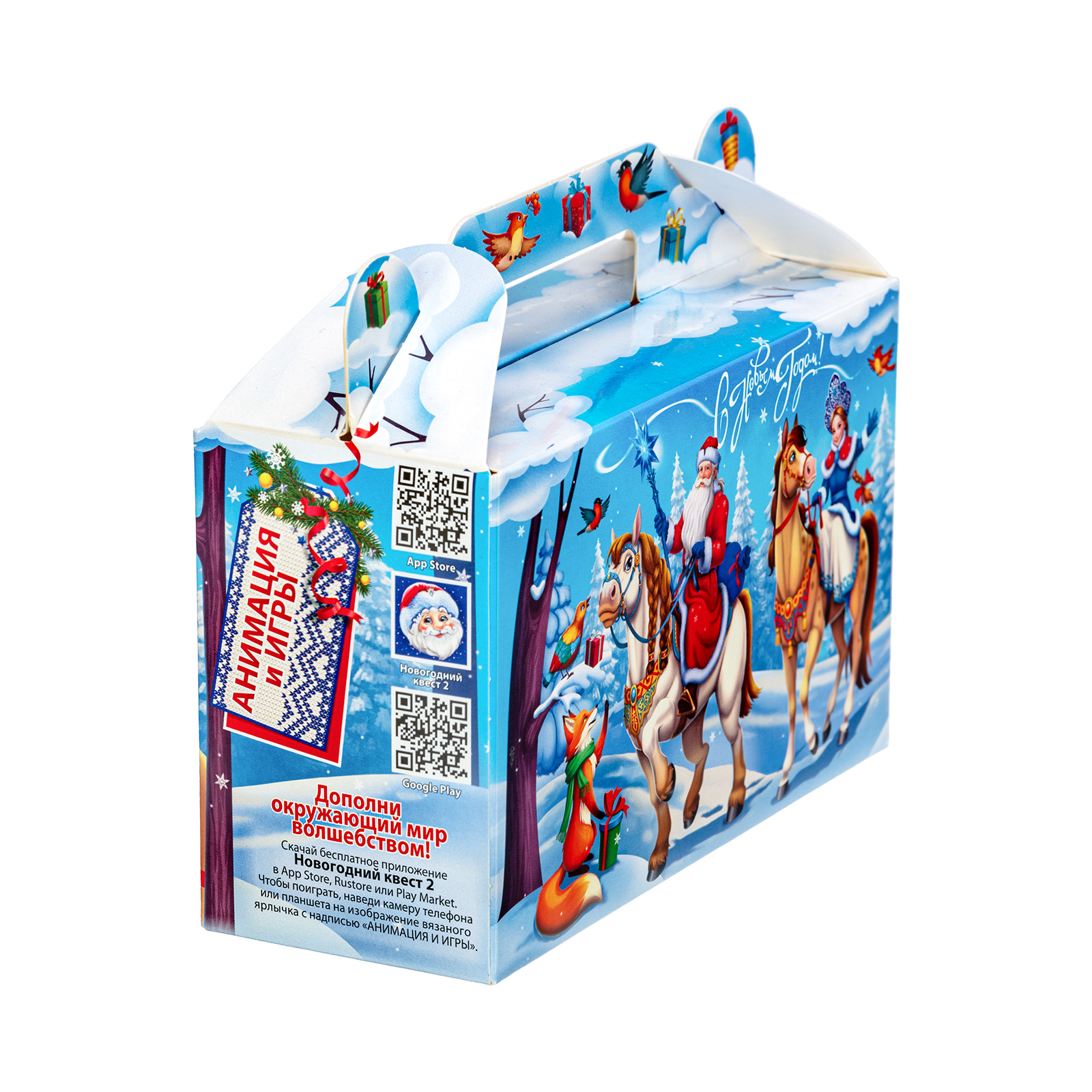 Новогодний сладкий подарок должен быть не только вкусным, но и привлекательным. Именно таким и является подарочный набор “Дружная команда”! Это компактный подарок в традиционной картонной упаковке в форме небольшого чемоданчика. На нежно-голубом фоне изображена картина роскошного снежного леса. На передней части упаковки мы видим главных действующих лиц - Дедушку Мороза, Снегурочку, грациозных лошадок и парочку лесных зверят. Вся дружная компания приветливо смотрит на нас и приглашает присоединиться к праздничному чаепитию с вкусными сладостями, которые бережно хранятся в этом замечательном чудо-сундучке.