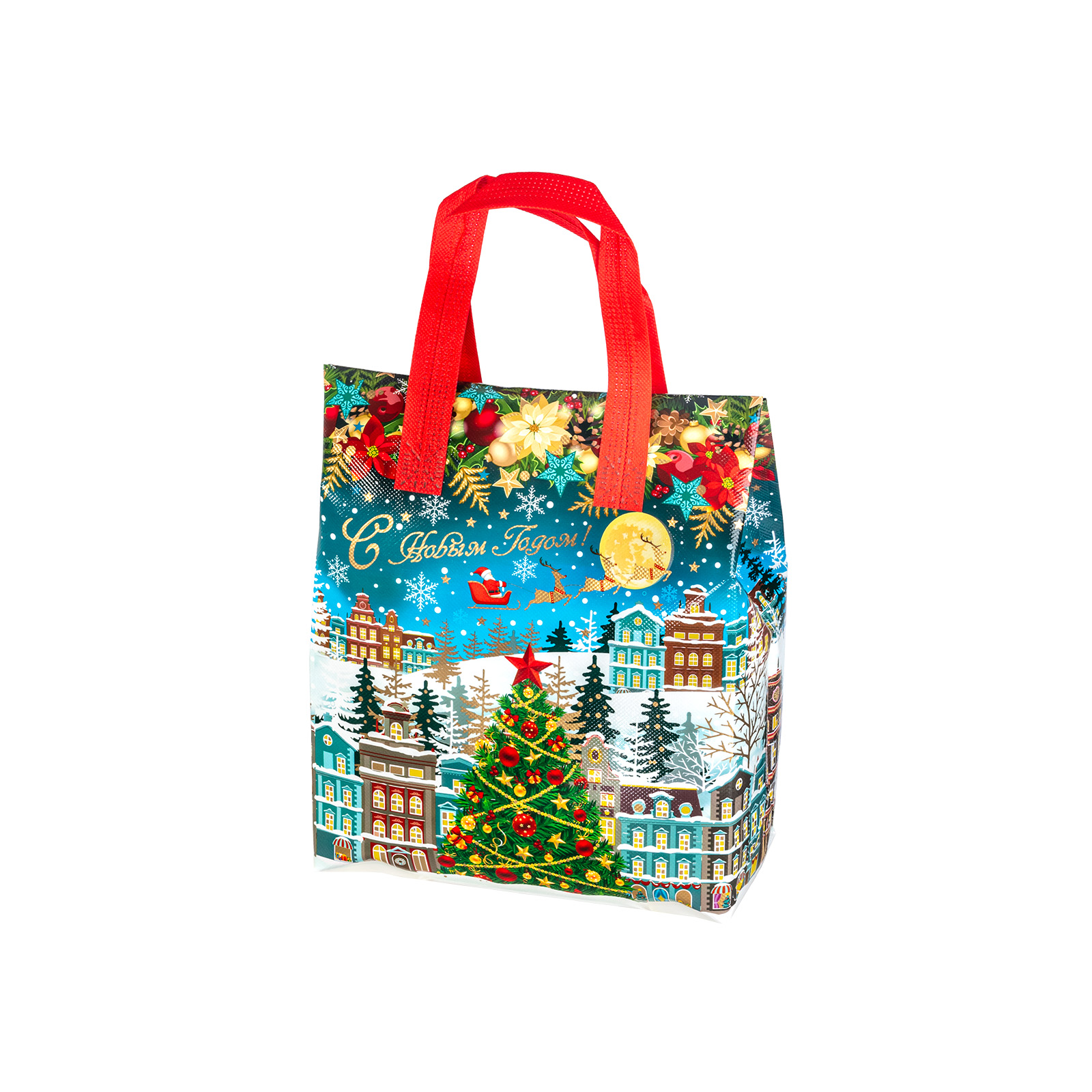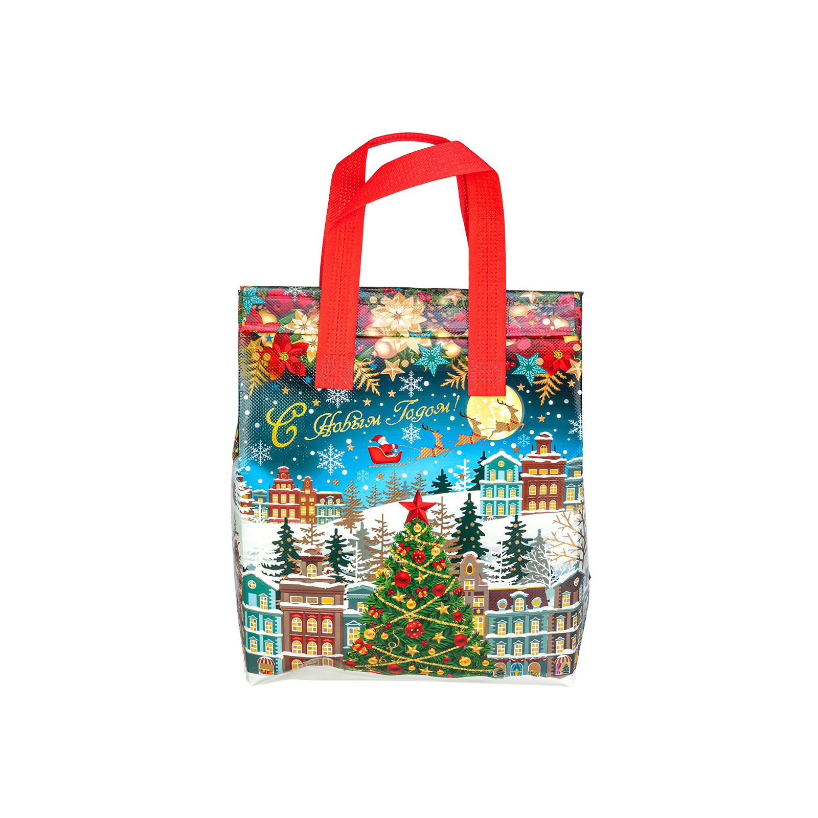 Интересный вариант новогоднего подарка – «Сумочка Чудо-городок». Отлично подойдет на подарок в 2026 году с символом Лошадь. Внутри такого презента находится кондитерский набор весом 1000 граммов.